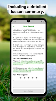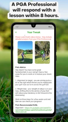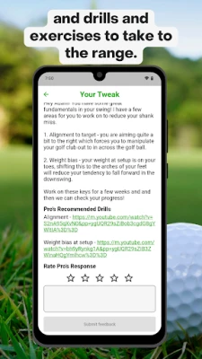 No, stručna analiza je samo početak. Osim dubinskog razumijevanja, Swingtweaks vam pruža i konkretne vježbe i zadatke koje možete primijeniti na vježbalištu kako biste automatizirali svoj novi, poboljšani zamah. Sve te dragocjene informacije i lekcije stižu izravno na vaš telefon, u vaš džep. Dovoljno je poslati snimku i ubrzo ćete dobiti fantastičnu golf lekciju koju možete koristiti i pregledavati uvijek iznova, bilo kada i bilo gdje, osiguravajući vam kontinuirani napredak na putu ka savršenstvu u golfu.